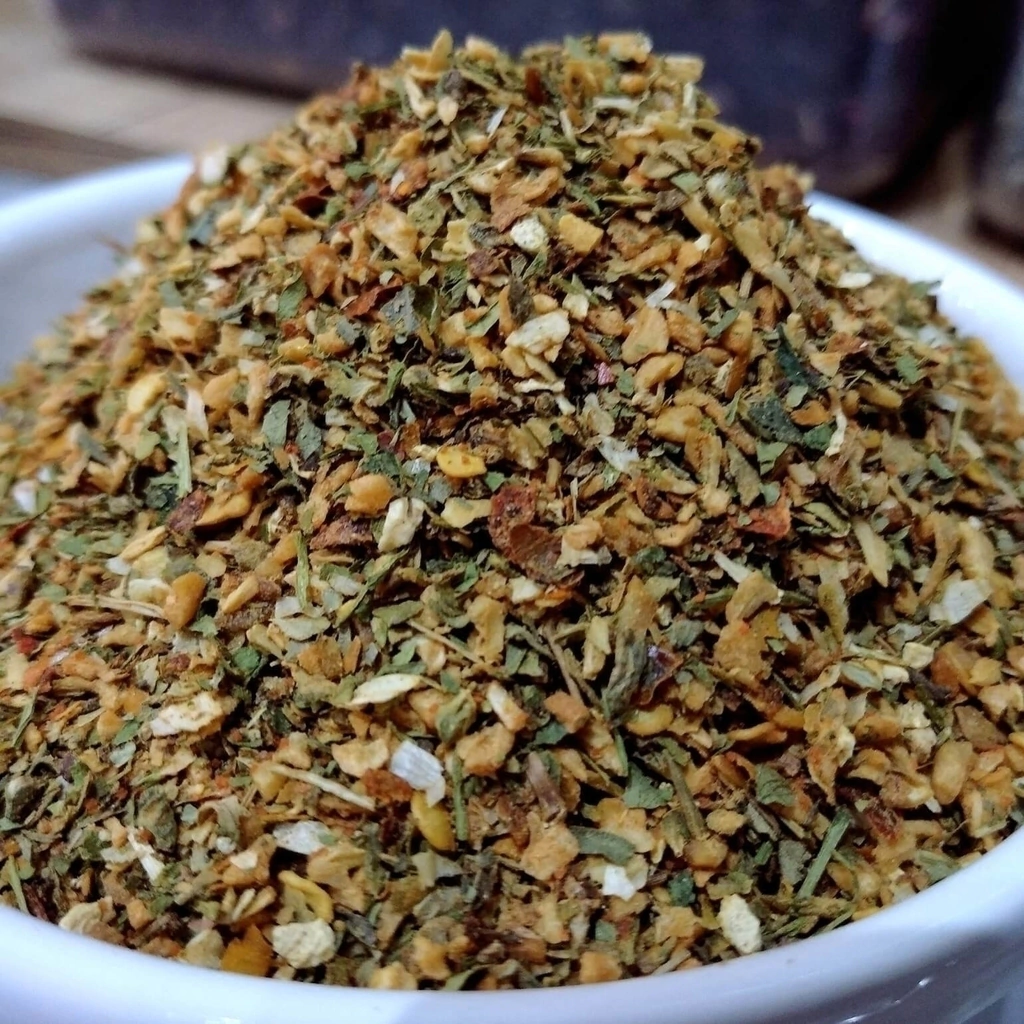Mistura de ervas desidratadas em pó e em flocos, possui uma coloração que varia entre o amarelo e o verde das ervas.